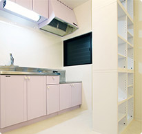 パープルにペイントしたキッチン。もともと玄関エントランスからキッチンが見える状況だったのを天井までのびるシェルフで目かくしを。